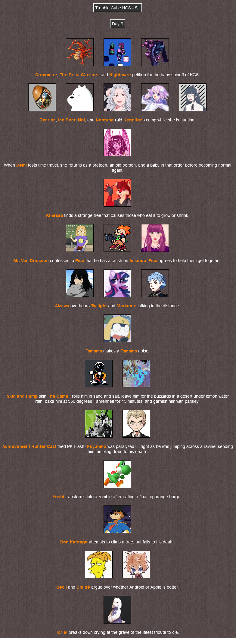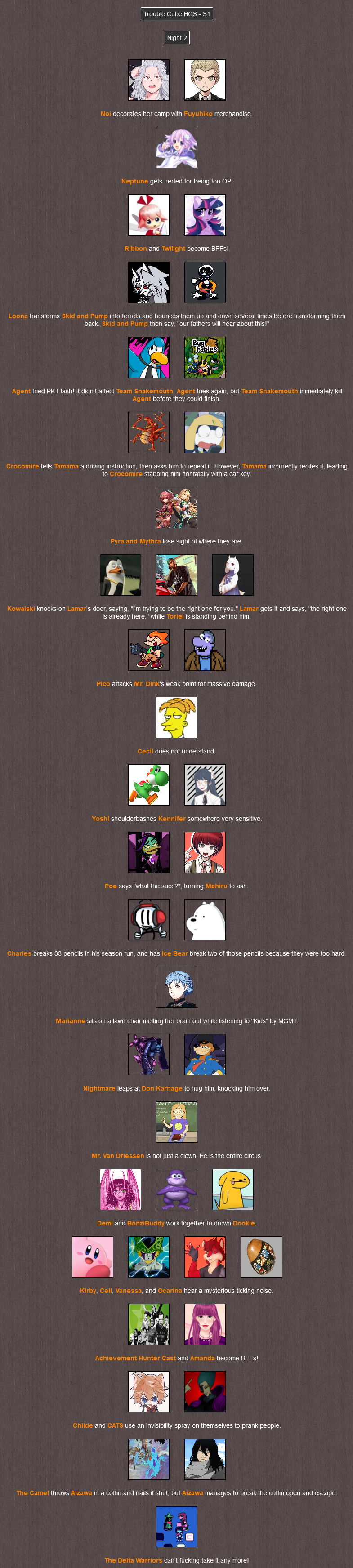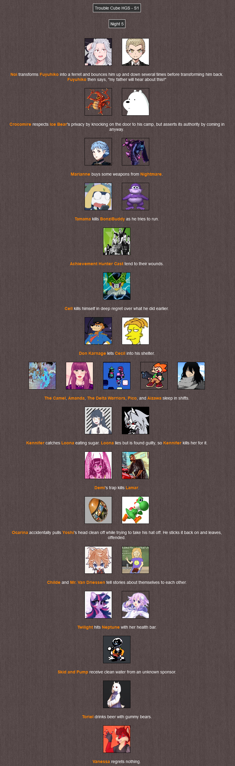 - After those deaths, we end the day on a heartwarming note, as many tributes gather to appreciate Loona's undeniable fluffiness! It doesn't look like she appreciates them back, though. Look at that eye twitch.